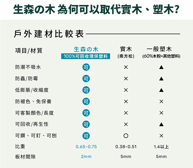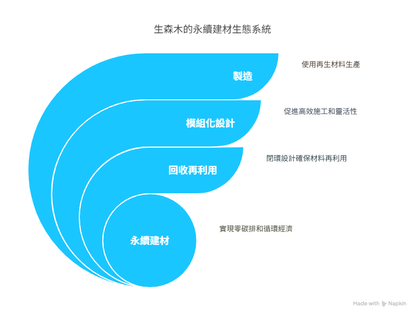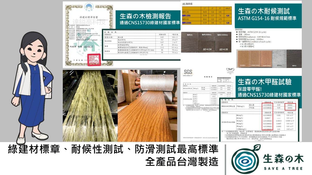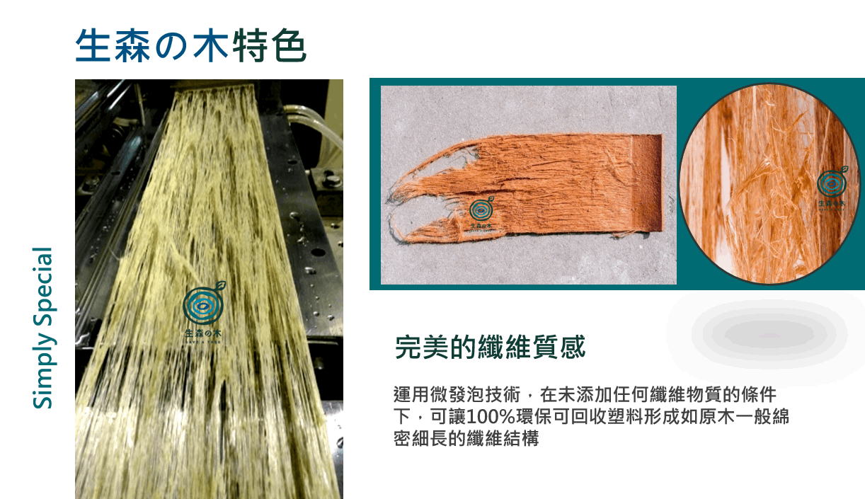 「生森の木」是一種100%可回收再用的永續建材,應用高分子材料科學技術,將廢棄工業塑膠製成高耐候性、防腐、防潮、防朽的仿實木綠建材,並榮獲內政部綠建材標章。「生森の木」是由英本工業集團(IBI Group)研發的新材料、創立的新品牌,堅持不採用任何木質成分,呼籲各界共同為地球保留一棵樹,串起循環經濟的價值鏈,成為循環經濟的領頭羊。