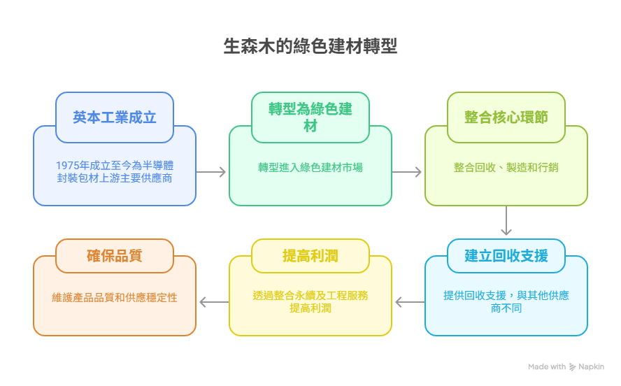 2018年起,由二代鄭安茹從美國回台接班,因應循環經濟的趨勢,領導新事業部跨足建材事業,將英本集團及塑膠產業產生的大量工業廢塑料,結合企業多年累積的材料科學技術,將廢塑料再利用,製成高品質的綠建材,並創立全新綠建材品牌「生森の木」,持續開展綠建材的多元應用,呼籲各界為地球保留一棵樹,達成企業ESG永續目標。