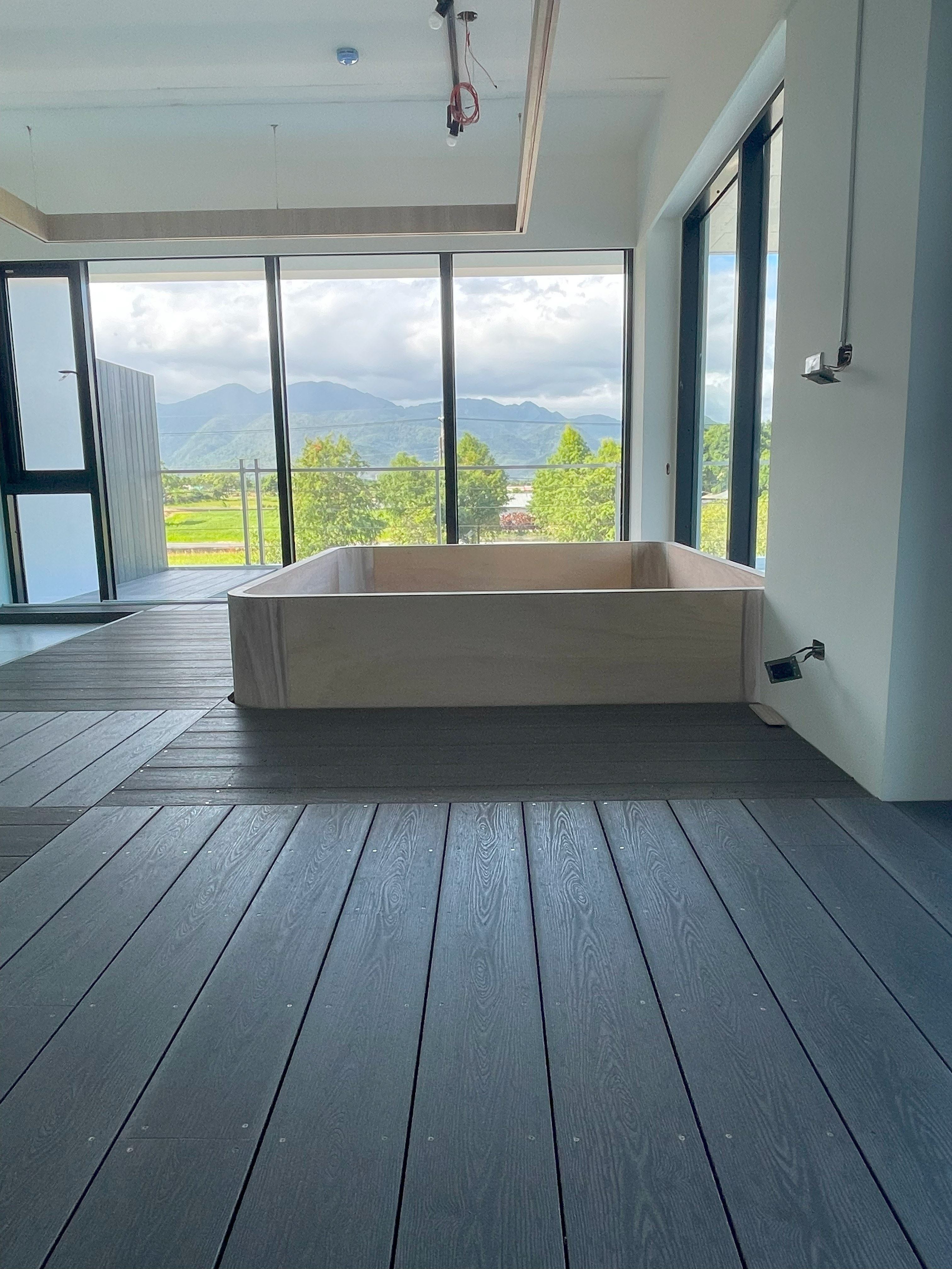 🏊泳池區地板,亦採用#鐵木色系,SGS檢測業界最高防滑系數,讓來訪賓客安心享受沉浸式度假體驗。